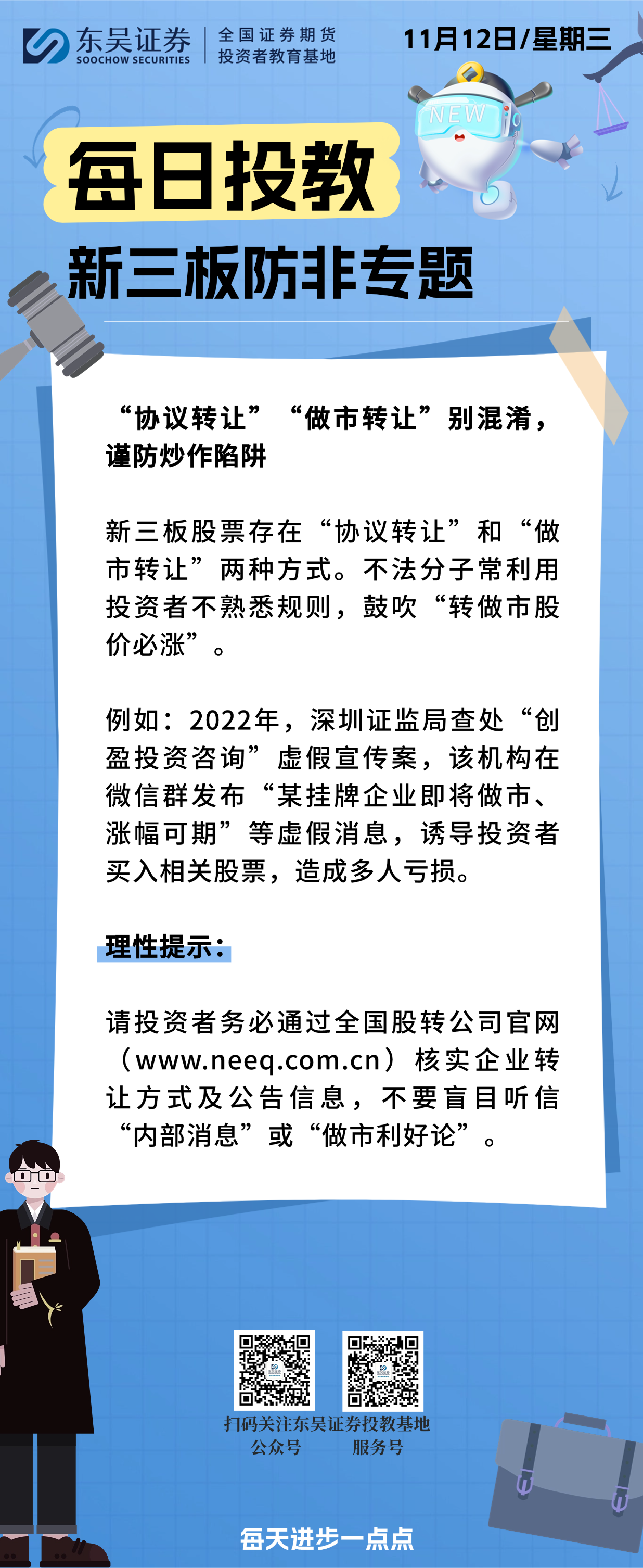 每日投教 | 【2025年11月12日】“协议转让”“做市转让”别混淆,谨防炒作陷阱