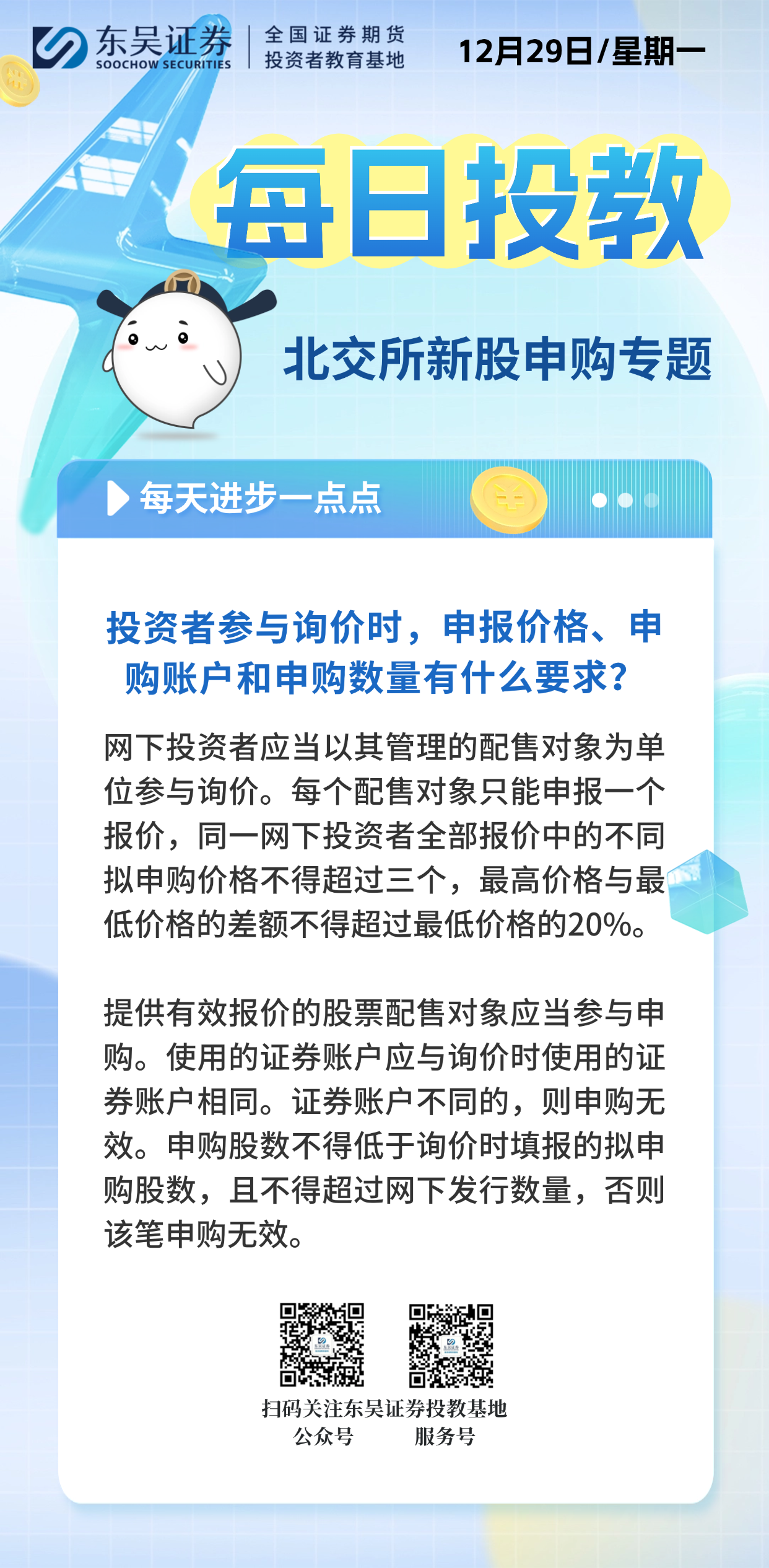 每日投教 | 【2025年12月29日】投资者参与询价时,申报价格、申购账户和申购数量有什么要求?