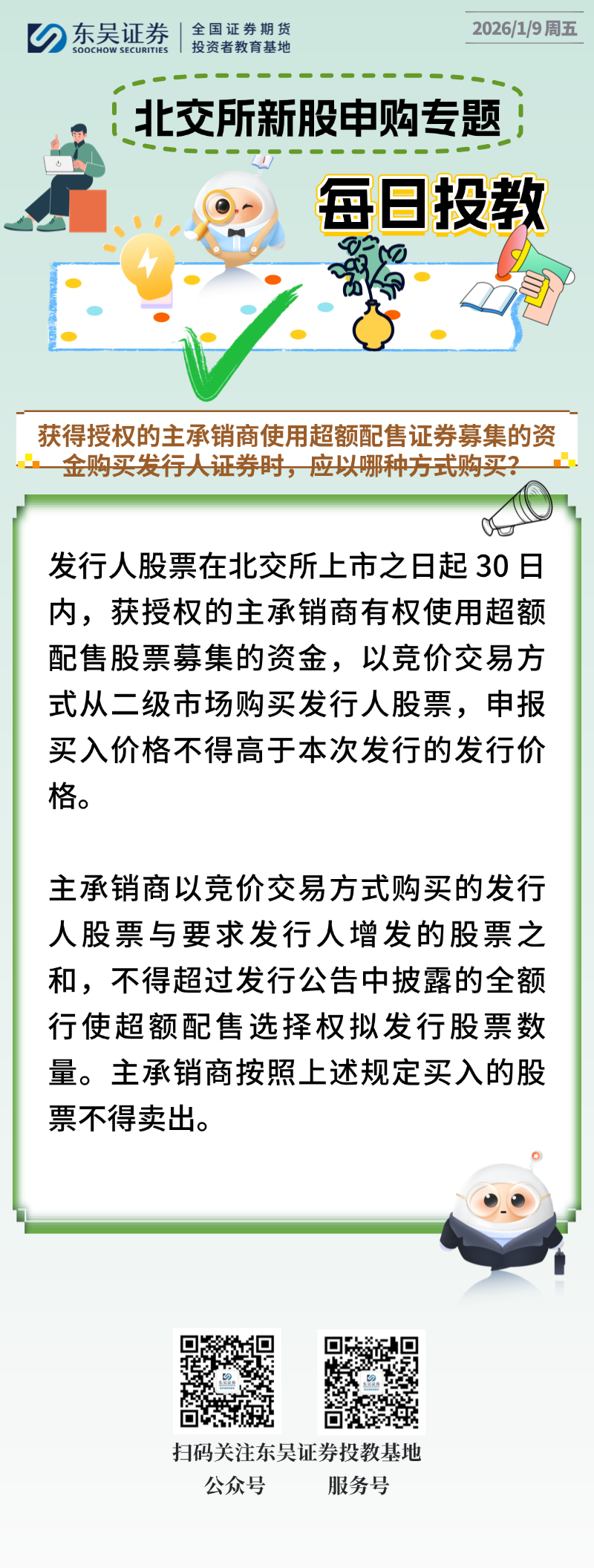 每日投教 | 【2026年01月09日】获得授权的主承销商使用超额配售证券募集的资金购买发行人证券时,应以哪种方式购买?