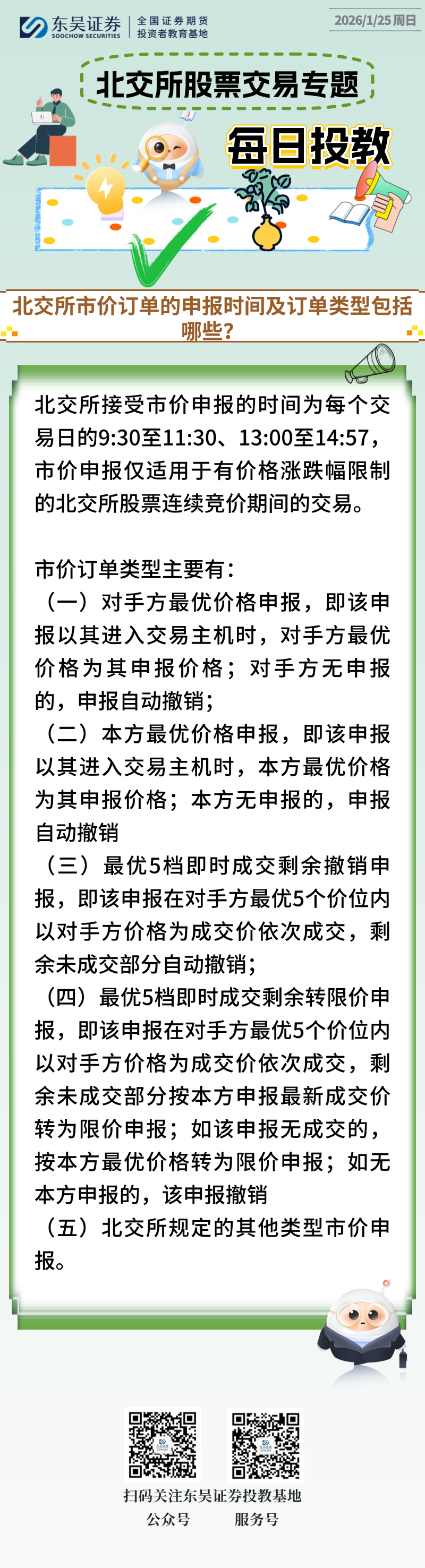 每日投教 | 【2026年01月25日】北交所市价订单的申报时间及订单类型包括哪些?