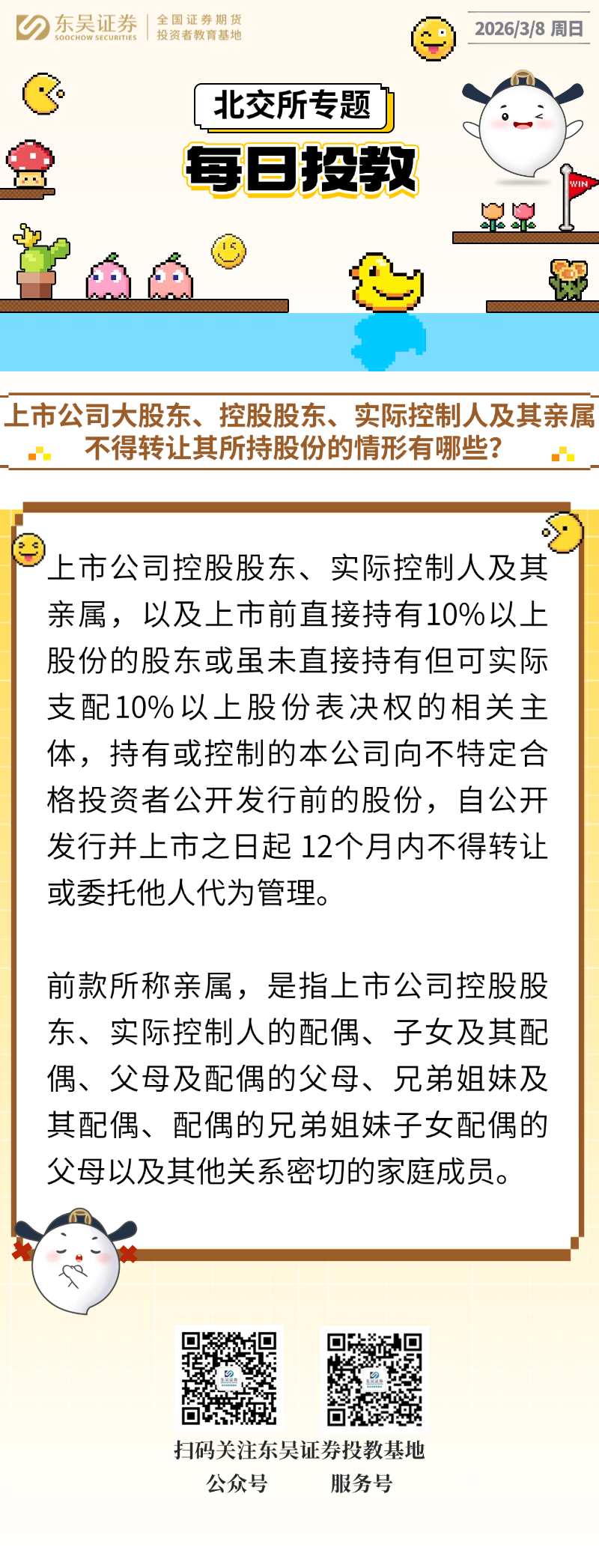 每日投教 | 【2026年03月08日】上市公司大股东、控股股东、实际控制人及其亲属不得转让其所持股份的情形有哪些?