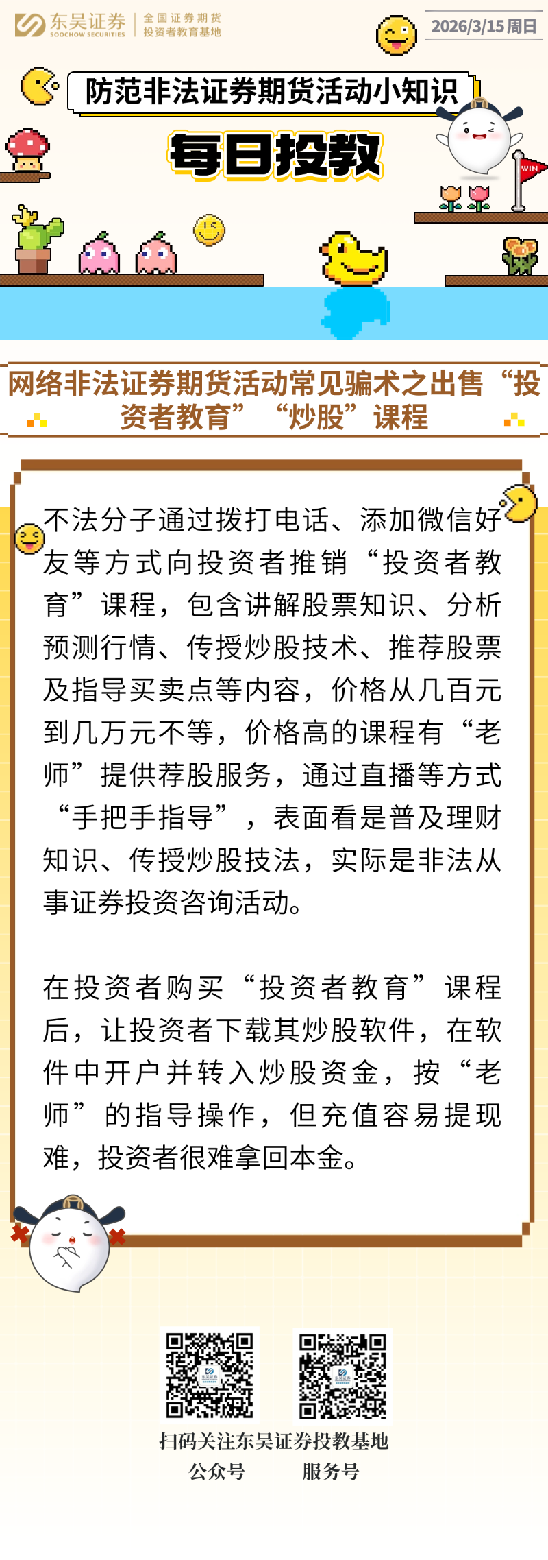 每日投教 | 【2026年03月15日】网络非法证券期货活动常见骗术之出售“投资者教育”“炒股”课程